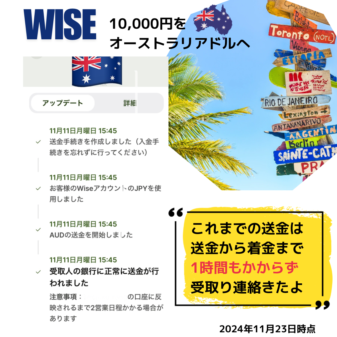 ちなみにこれまで我が家でも日本からオーストラリアに4,5回送金していますが、いずれも1時間以内に着金の連絡が来てます。