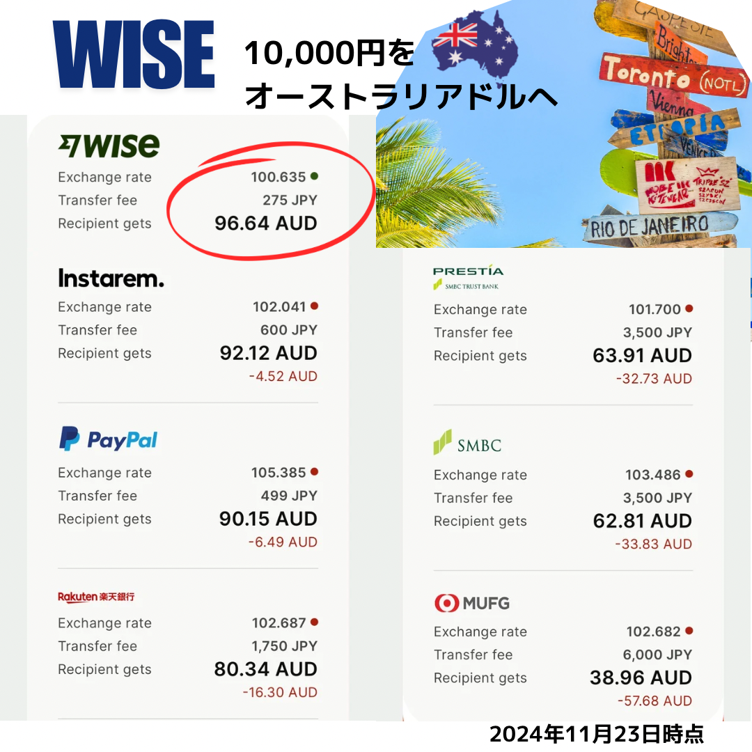 Wiseではリアルタイムの為替レート(ミッドマーケットレート)が適用され、他社と比べても手数料が格安です。